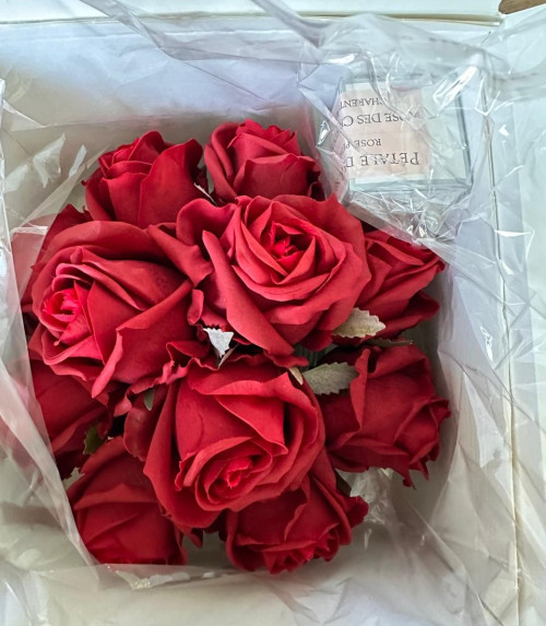 Красивая композиция из бутонов роз темно красного цвета, удивит естественным внешним видом и обновит Ваш декор и наполнит дом ароматом цветов Roses от Côte Noire. Каждый цветок искусно изготовлен вручную и имеет специальное натуральное покрытие, которое придает ему естественный оттенок и внешний вид. Утонченные французские розы выполнены настолько реалистично, словно сорваны в саду сегодня утром. Розы установлены в стеклянной вазе с гелем, наполненным прекрасным ароматом. Каждая роза красиво упакована вкоробку с лентами. Кроме того, к букету дополнительно в комплекте 2 бутылочки изысканных ароматов розы, которые распыляются на цветы, чтобы освежить и улучшить их аромат когда это необходимо.